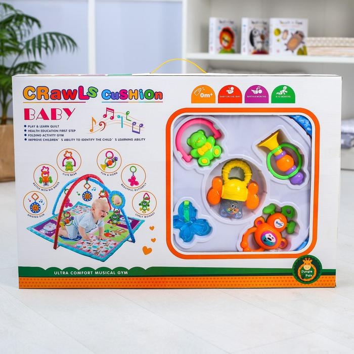 Малыш играет на спинке лёжа. На самом раннем этапе своего развития малыш тянется за яркими, притягивающими внимание игрушками и учится их хватать, так же малыш видит свое отражение в безопасном зеркальце и улыбается. В комплекте с ковриком прилагаются подвесные игрушки, яркие и привлекательные, они служат для развития тактильных ощущений и зрения.