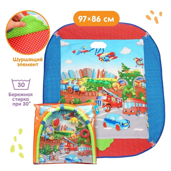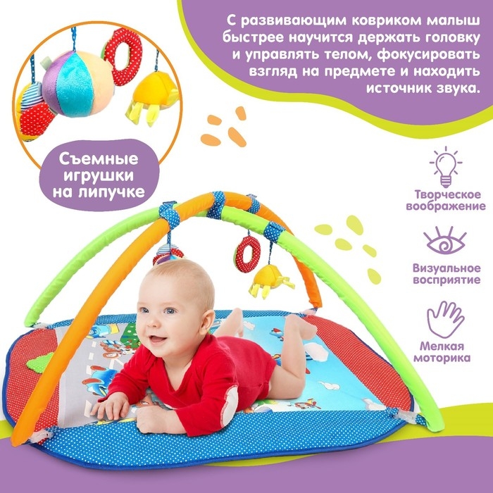 Детский коврик предназначен для весёлых игр и гармоничного развития малыша. Изделие обязательно заинтересует кроху, ведь в нём есть много привлекательных элементов, которые можно рассматривать и изучать на ощупь.