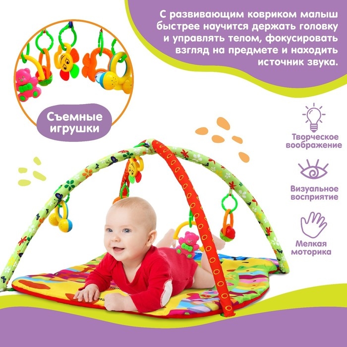 Малыш играет на спинке лёжа. На самом раннем этапе своего развития малыш тянется за яркими, притягивающими внимание игрушками и учится их хватать, так же малыш видит свое отражение в безопасном зеркальце и улыбается. В комплекте с ковриком прилагаются подвесные игрушки, яркие и привлекательные, они служат для развития тактильных ощущений и зрения.