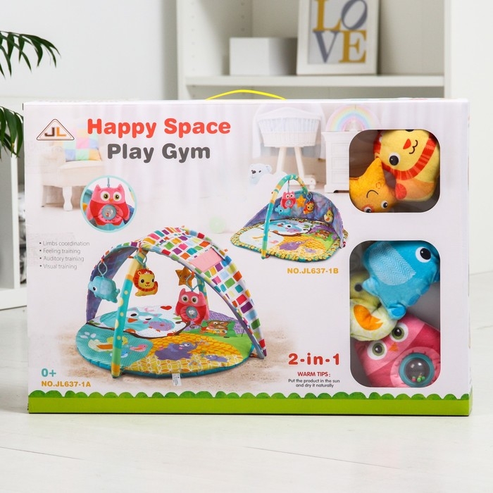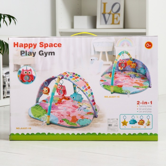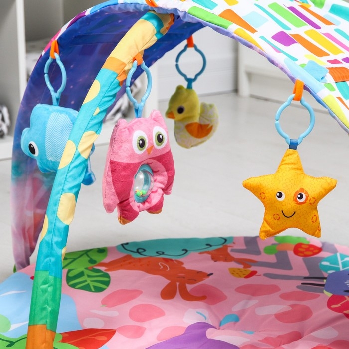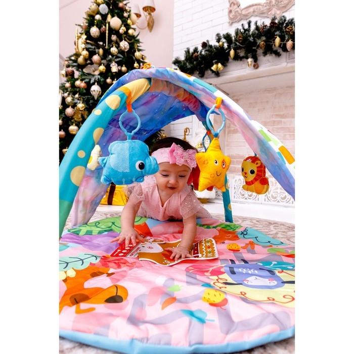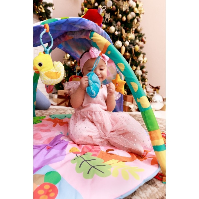 Малыш играет на спинке лёжа. На самом раннем этапе своего развития малыш тянется за яркими, притягивающими внимание игрушками и учится их хватать, так же малыш видит свое отражение в безопасном зеркальце и улыбается. В комплекте с ковриком прилагаются подвесные игрушки, яркие и привлекательные, они служат для развития тактильных ощущений и зрения.