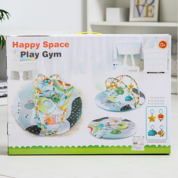 Малыш играет на спинке лёжа. На самом раннем этапе своего развития малыш тянется за яркими, притягивающими внимание игрушками и учится их хватать, так же малыш видит свое отражение в безопасном зеркальце и улыбается. В комплекте с ковриком прилагаются подвесные игрушки, яркие и привлекательные, они служат для развития тактильных ощущений и зрения.