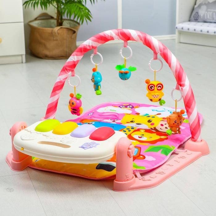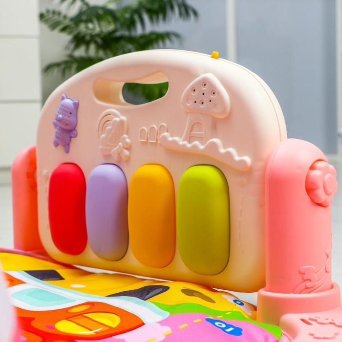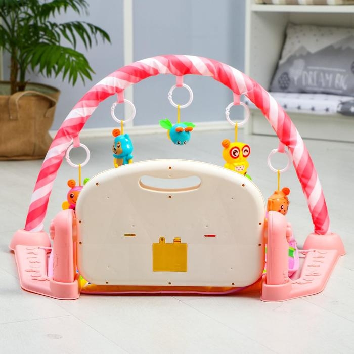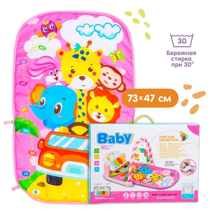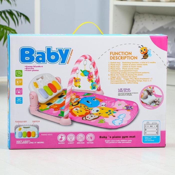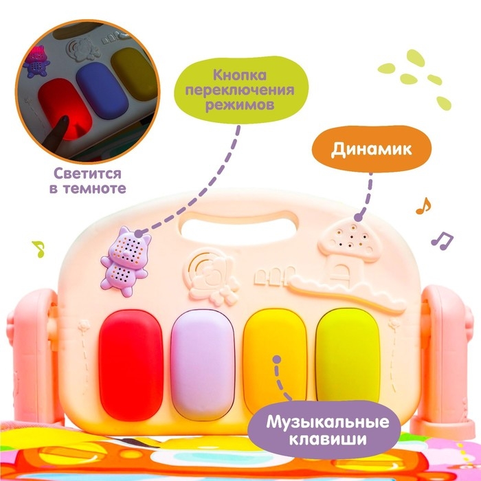 Сначала кроха, лёжа на спинке, будет просто с интересом разглядывать яркие игрушки на дуге, развивая зрительные навыки и способность фокусировать взгляд на объекте. Со временем он начнёт тянуться к этим привлекательным игрушкам ручками и ножками, совершенствуя хватательный рефлекс и двигательные функции. Постепенно малыш сможет наступать на клавиши пианино ножками и включать музыку и световые эффекты.