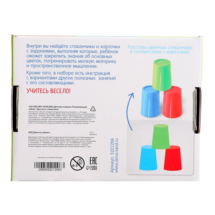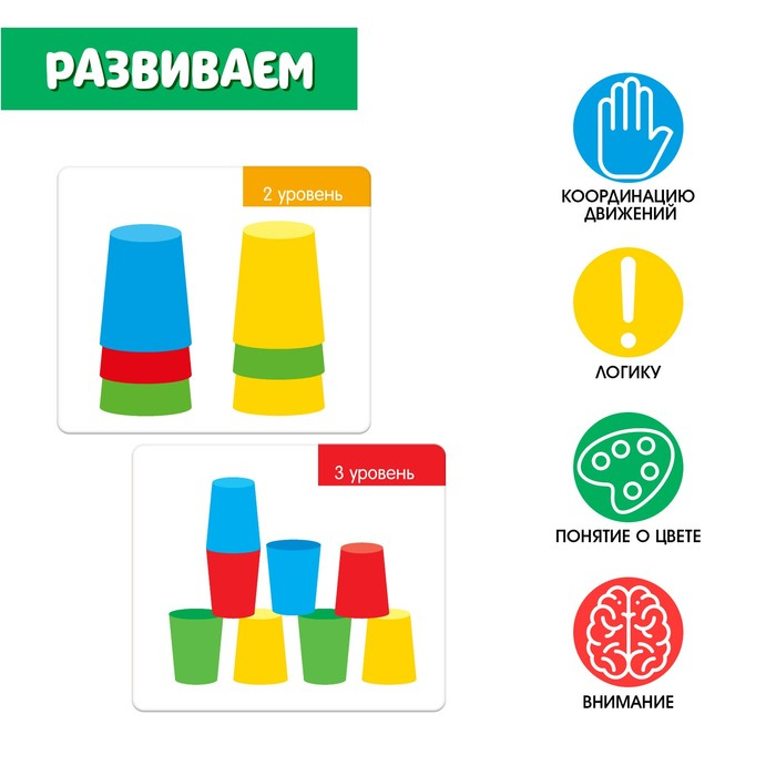 Развивающий набор «Цветные стаканчики» подходит для занятий по методике Монтессори. Занимаясь, малыш быстро запомнит цвета и научится считать.