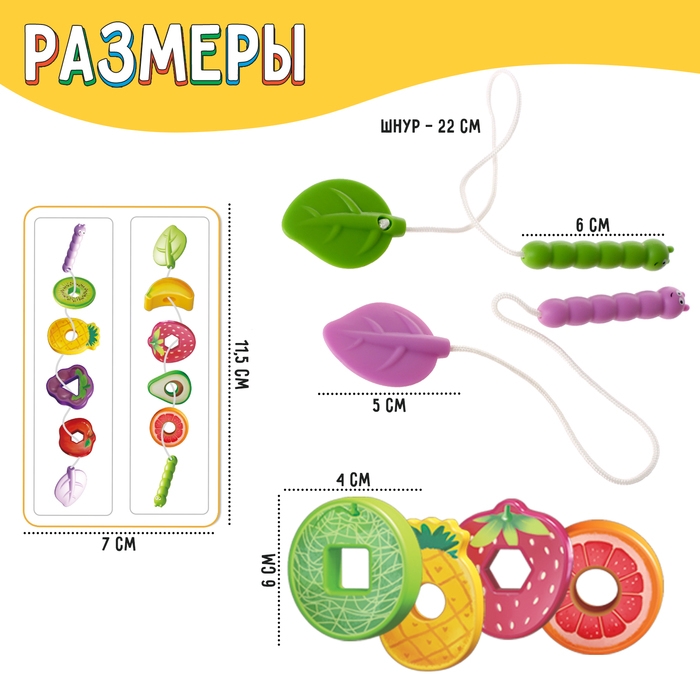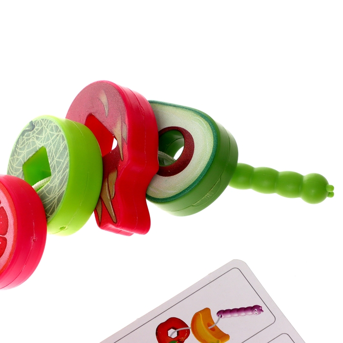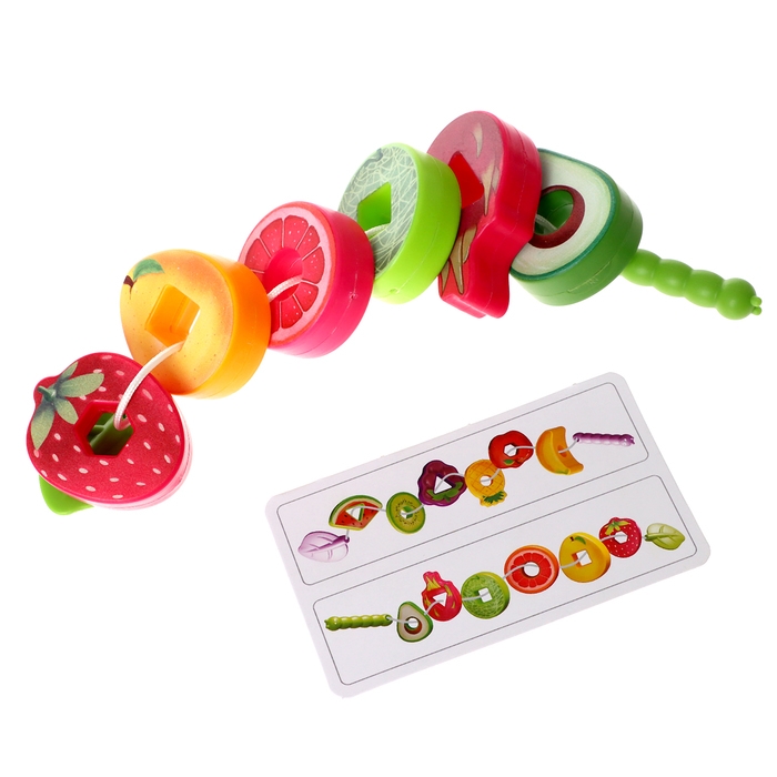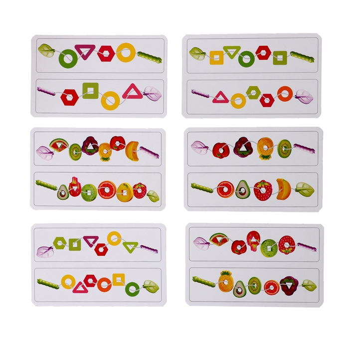 Внутри вы найдёте 6 карточек со схемами, 2 шнурка и 12 фруктов.