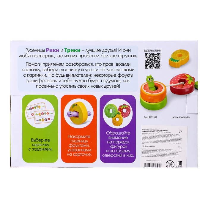 Развивающий набор «Фруктовая шнуровка» разработан специально для малышей от 3 лет. С помощью шнуровки с яркими фруктами и гусеницами малыш в лёгкой игровой форме потренирует внимательность, моторику, зрительную память и воображение.