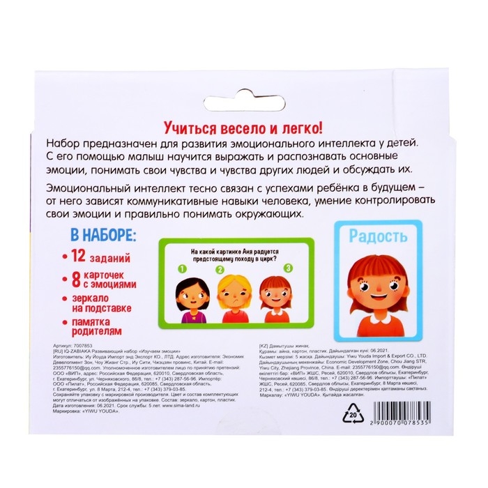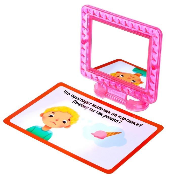 В комплекте 12 заданий, 8 карточек с эмоциями, зеркало на подставке и правила игры в инструкции.