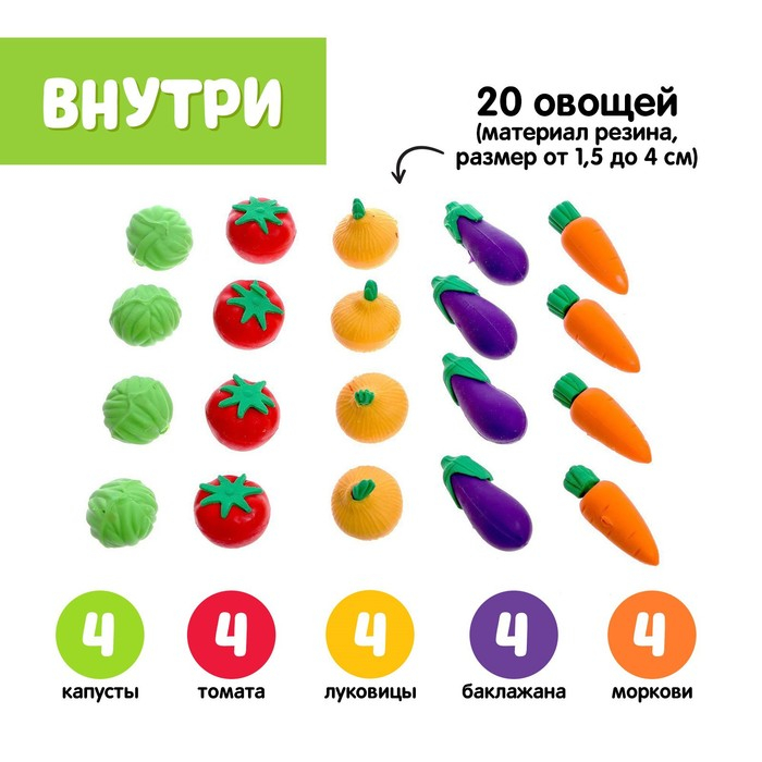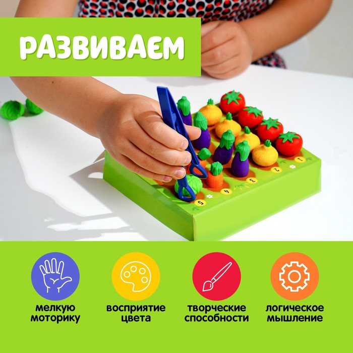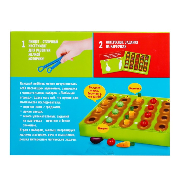 В комплект входит игровое поле с грядками, 20 овощей, карточки с 20 заданиями, пинцет.