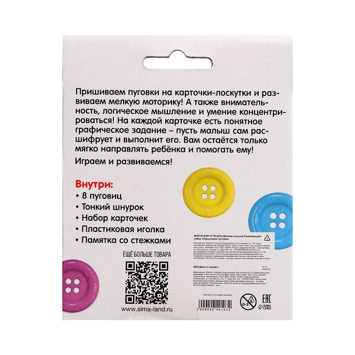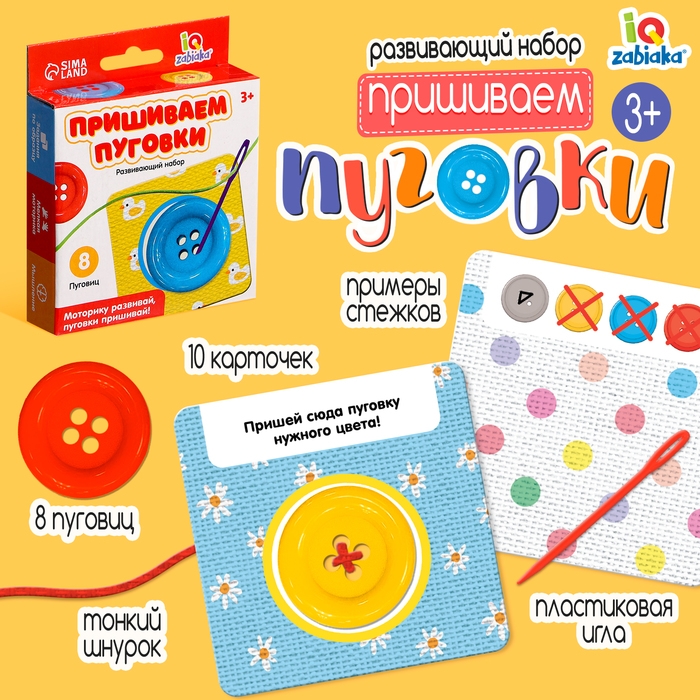 «Пришиваем пуговки» — развивающий набор для детей от 3 лет. Малышка представит себя в роли швеи, которой предстоит выполнить заказы клиентов. Такая игра надолго увлечёт маленьких непосед и подарит радостные эмоции.