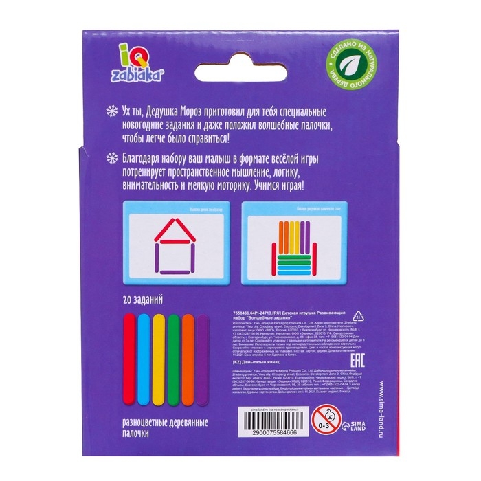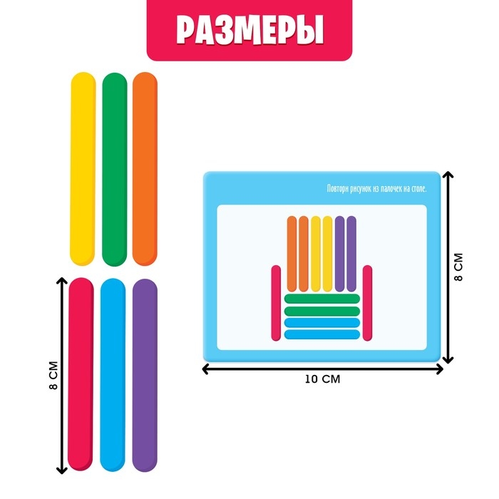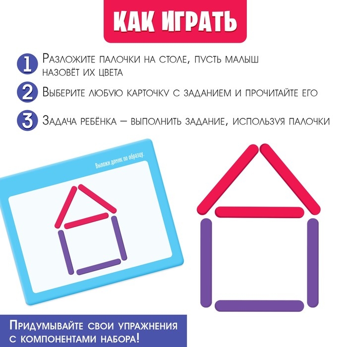 Внутри набора вы найдёте разноцветные палочки и карточки с заданиями.