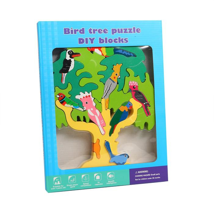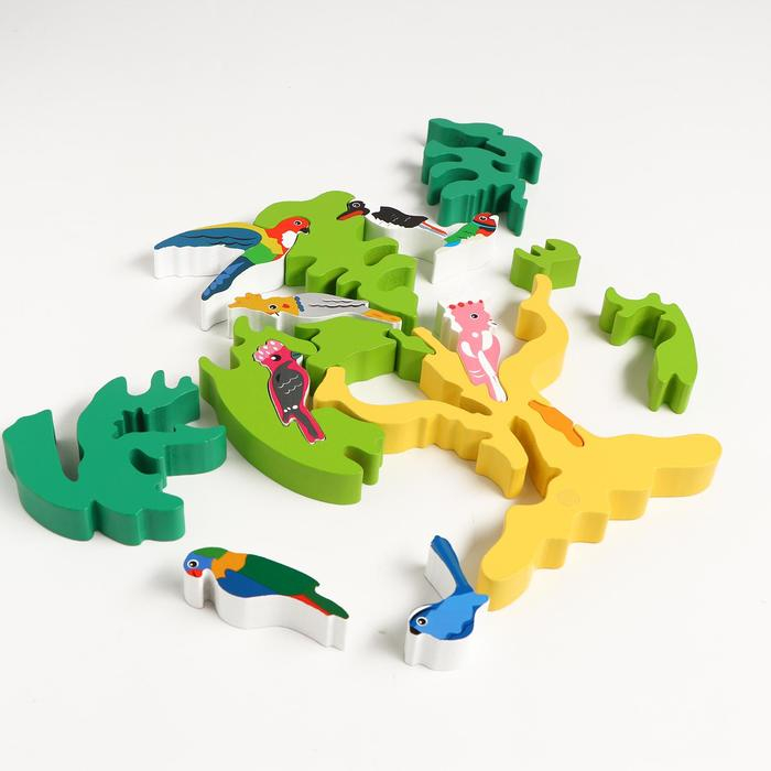 Задача ребёнка — подобрать фигурки таким образом, чтобы составить дерево целиком и разместить на нём птиц.