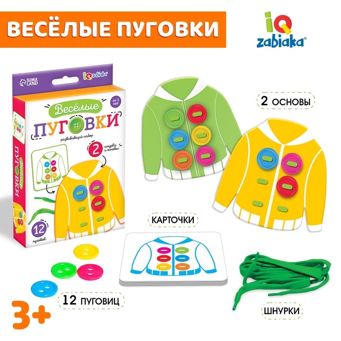 Внутри вы найдёте 2 основы, 2 шнурка и 12 цветных пуговок.