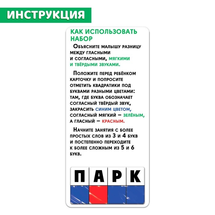 - Положите перед ребёнком карточку и попросите отметить квадратики под буквами разными цветами: там, где буква обозначает согласный твёрдый звук, закрасить синим цветом, согласный мягкий — зелёным, а гласный — красный.