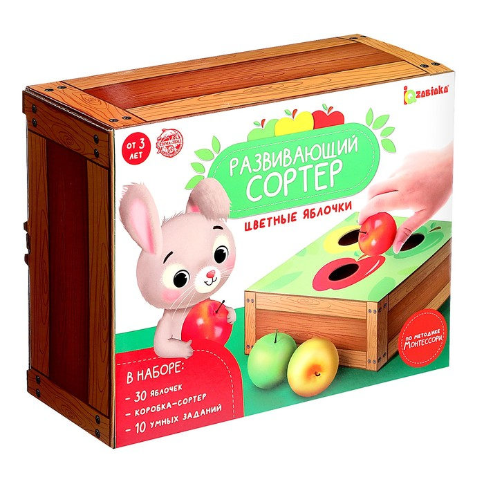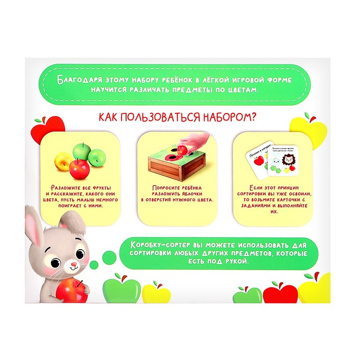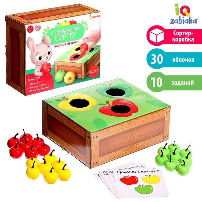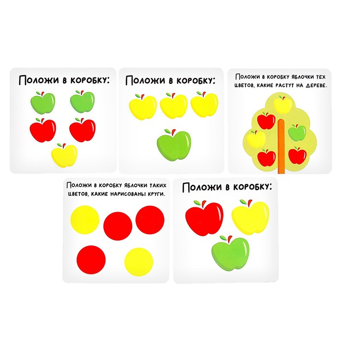 В комплекте есть 30 яблочек, коробка-сортер и 10 логических заданий.