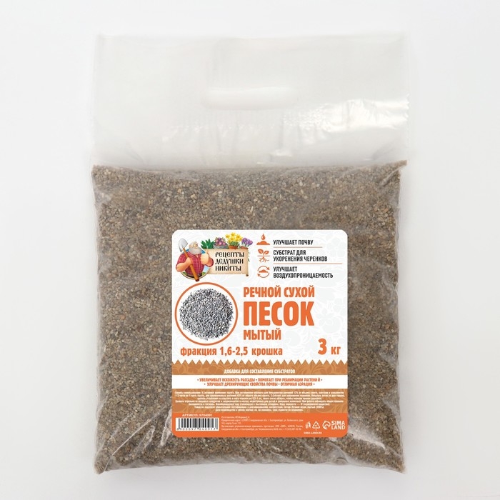 Речной песок "Рецепты дедушки Никиты", сухой, фр 1,6-2,5, крошка, 3 кг