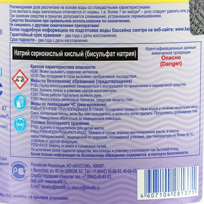Способ применения: для поддержания оптимального значения рН воды бассейна в пределах 7,2-7,6 необходимо 2-3 раза в неделю проводить контрольные замеры тестером. Значение рН выше 7,6 должно быть снижено до рекомендуемых значений добавлением средства «Регулятор рН-минус». Для понижения рН на 0,2 необходимо в 10 м3 воды добавить 150 грамм средства. Средство растворить в распределительном баке дозирующего насоса из расчета 2 кг на 10 литров воды. При отсутствии распределительного бака средство предварительно следует растворить в какой-либо емкости, после чего влить раствор порциями вблизи сопла возврата отфильтрованной воды или в нескольких местах, но только не перед фильтрами. Максимальная растворимость средства примерно 250 грамм на 1 литр воды при 25°С. Рекомендуемая доза рассчитана на основе воды со стандартными характеристиками. Если жесткость воды значительно отличается от нормы, т.е. более 7 мг-экв/дм3 – дозу следует удвоить или утроить.