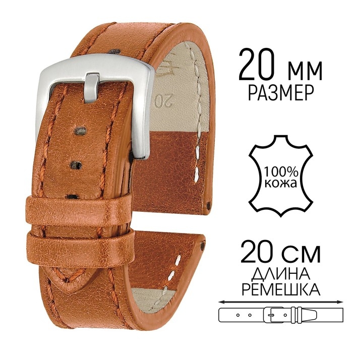 Ремешок для часов, 20 мм, запряжник 80 мм, горт 120 мм, натуральная кожа, рыжий
