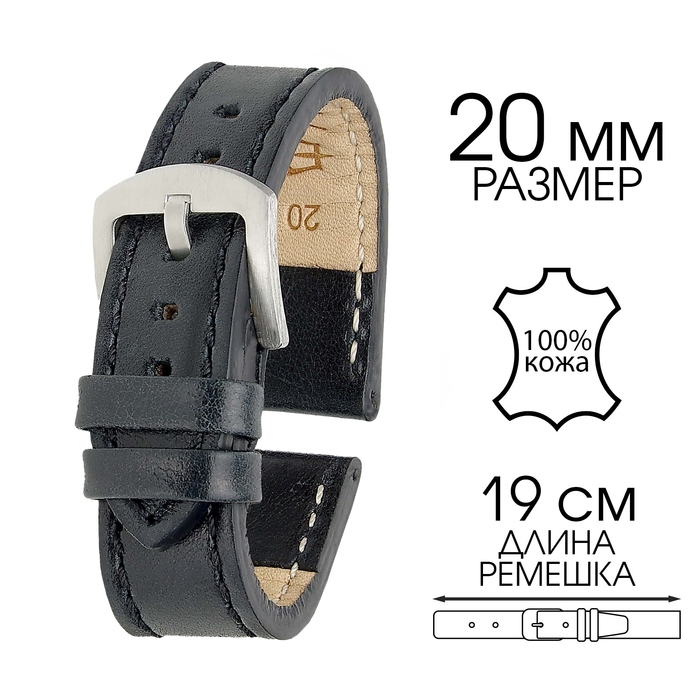 Ремешок для часов, мужской, 20 мм, запряжник 75 мм, горт 115 мм, натуральная кожа