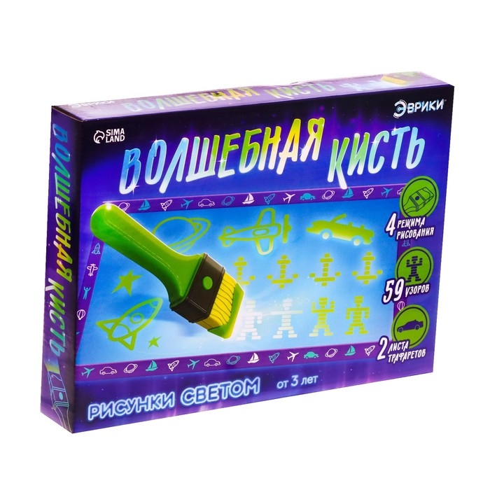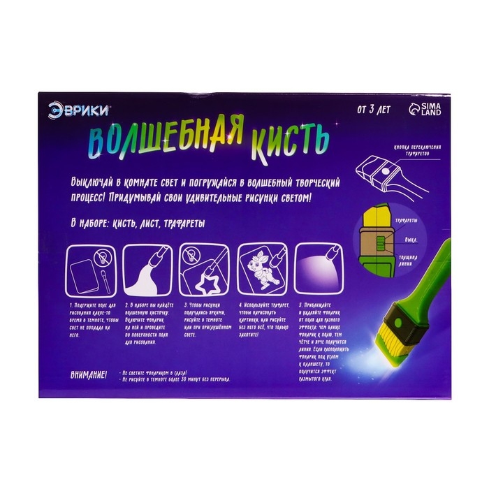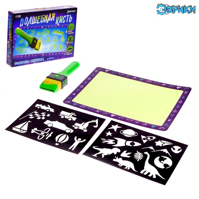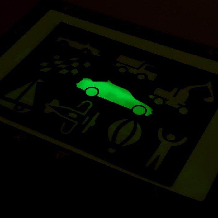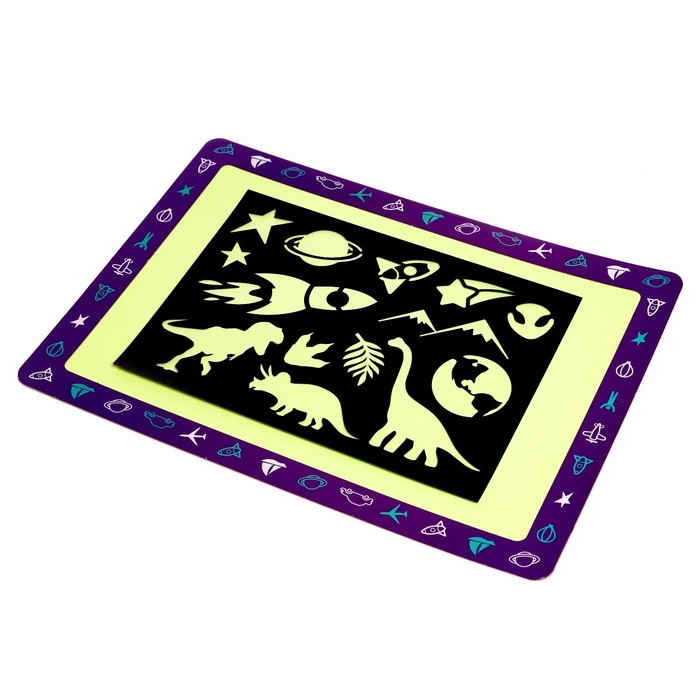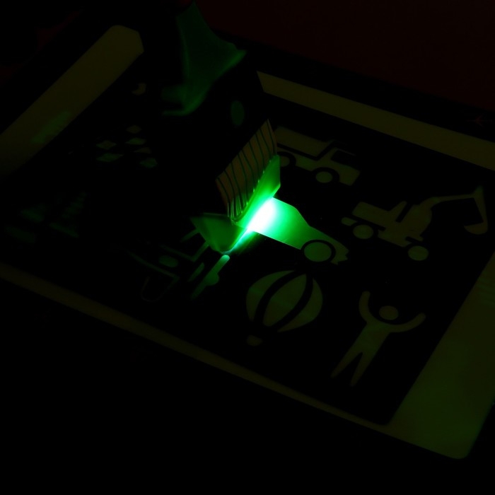С помощью набора для рисования светом в темноте ребёнок научится рисовать волшебные, светящиеся рисунки. В этом ему помогут трафареты из комплекта, с различными изображениями.