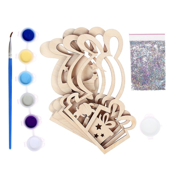 - В комплект входят деревянные заготовки, краски, блёстки и кисточка.
