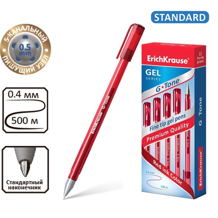 Ручка гелевая ErichKrause G-Tone, узел 0.5 мм, чернила красные, длина линии письма 500 метров