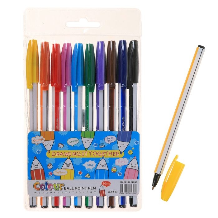 Набор ручек шариковых, 10 цветов, корпус прозрачный, с цветными колпачками