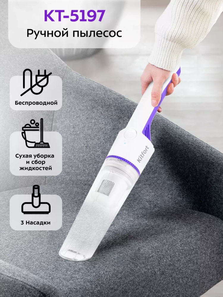 Ручной пылесос Kitfort КТ-5197 это портативное и компактное устройство, которое легко справится с пылью, мусором и небольшим количеством разлитой жидкости. Благодаря работе от аккумулятора пылесос имеет неограниченный радиус действия: от любого уголка квартиры до машины или беседки в саду. Небольшие габариты и малый вес пылесоса делают процесс уборки простым и удобным.