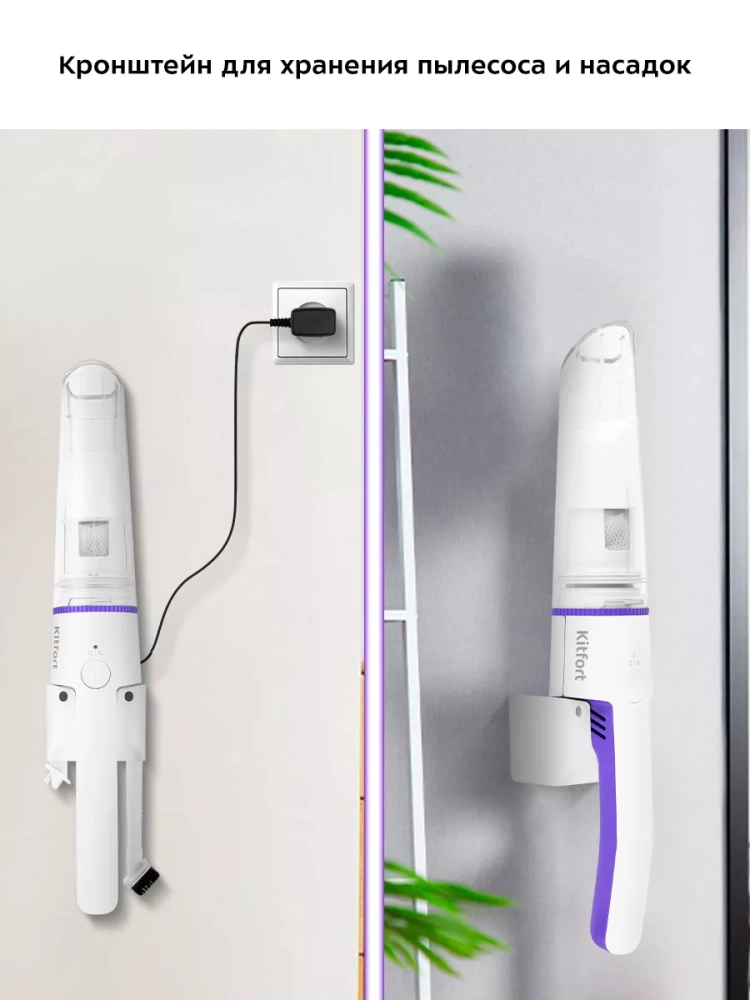 Компактность пылесоса и кронштейна делают прибор особенно удобным для оперативной уборки: прибор занимает мало места, его легко снять с кронштейна, а насадки всегда под рукой.