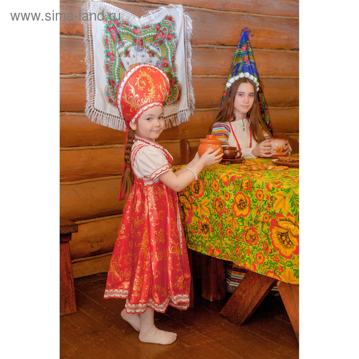 Русский народный костюм для девочки с кокошником, красно-бежевые узоры, р-р 60, рост 110-116 см