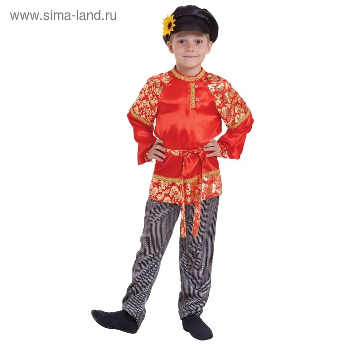 Русский народный костюм для мальчика "Хохлома с золотом", р-р 60, рост 116 см превратит вашего мальчика в добра молодца с широкой душой! Рубаха и штаны свободного кроя не сковывают движений и удобны при носке — они незаменимы для удалых национальных танцев! Дополняет комплект головной убор с ярким цветком.