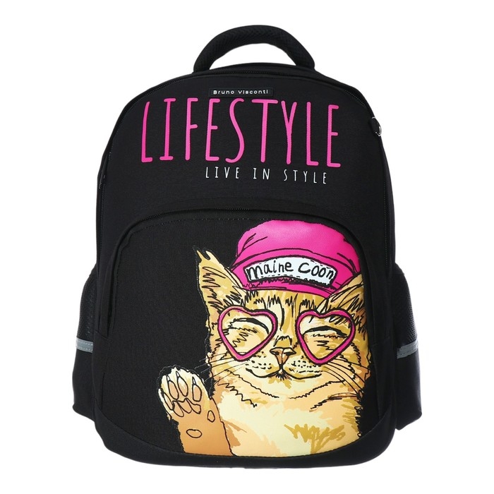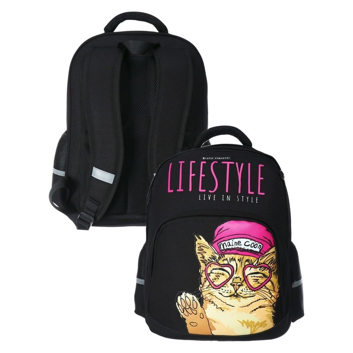 Рюкзак BrunoVisconti® классический черный с эргономичной спинкой «EASY LIFE.КОТЫ». Рюкзак школьный серии Junior «EASY LIFE. КOTЫ» ТМ BRUNO VISCONTI отличается мягкими боковыми и передними стенками при эргономичной посадке. Для его производства использовалась ткань premium качества: водонепроницаемая, морозостойкая, с повышенной износостойкостью, грязеотталкивающая плотностью 900 DEN. Благодаря сложнейшим современным технологиям нанесения на ткань рюкзак украшает авторский дизайн, соответствующий последним трендам. Плотная фирменная подкладка BRUNO VISCONTI идеально сочетается с дизайном и цветом самого рюкзака. Двунаправленные реверсивные надежные 8-мм молнии с 5-см пуллером на замках позволяют легко открывать и закрывать рюкзак. Вместительный рюкзак имеет большое отделение для тетрадей и учебников с потайным карманом и отделение для тетрадей с органайзером для канцтоваров.