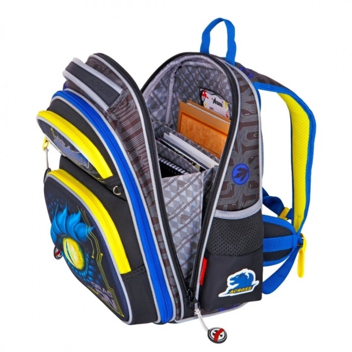 Рюкзак вмещает все необходимые форматы книг и папок. Нагрудный фиксатор способствуют равномерному распределению нагрузки. В нижней части рюкзака установлены пластиковые ножки.