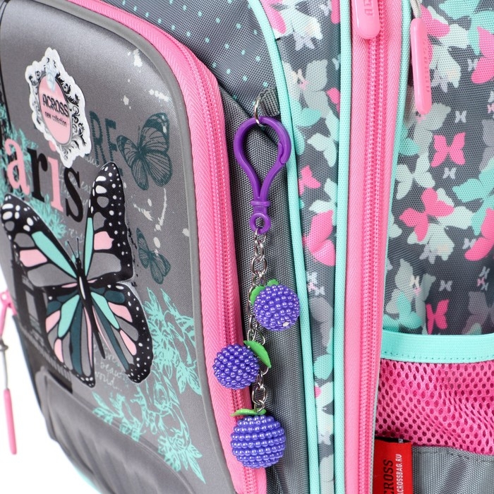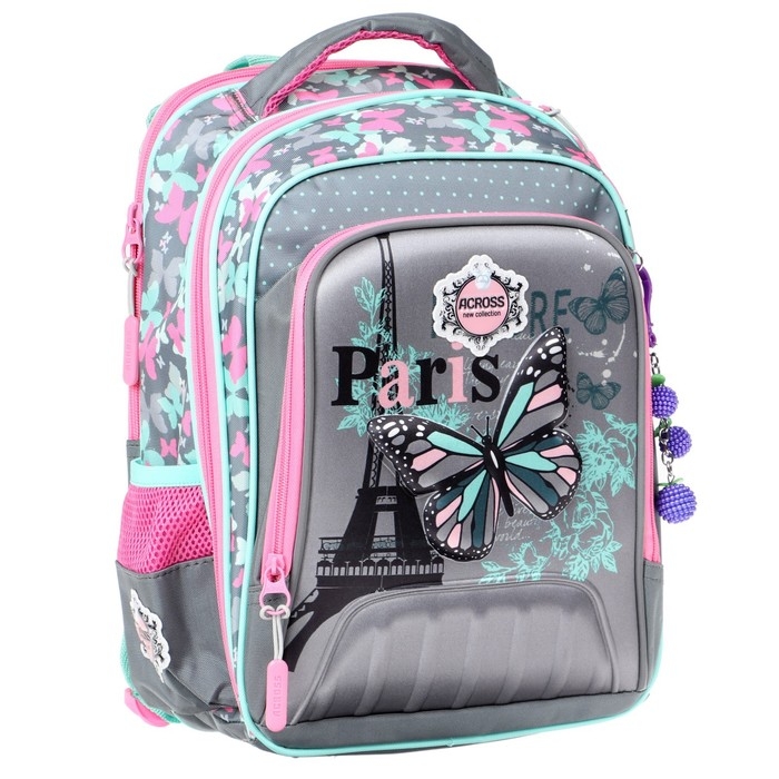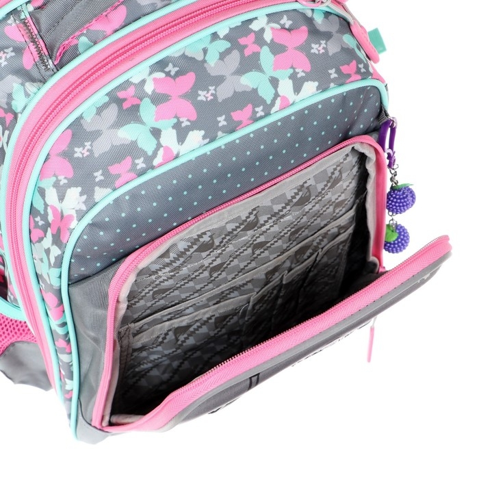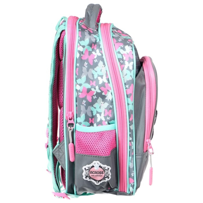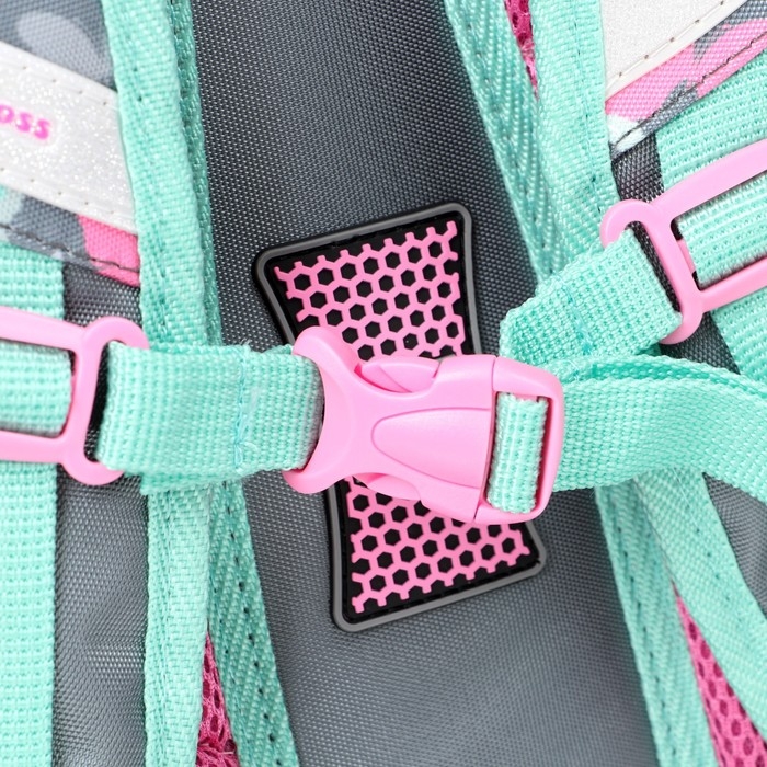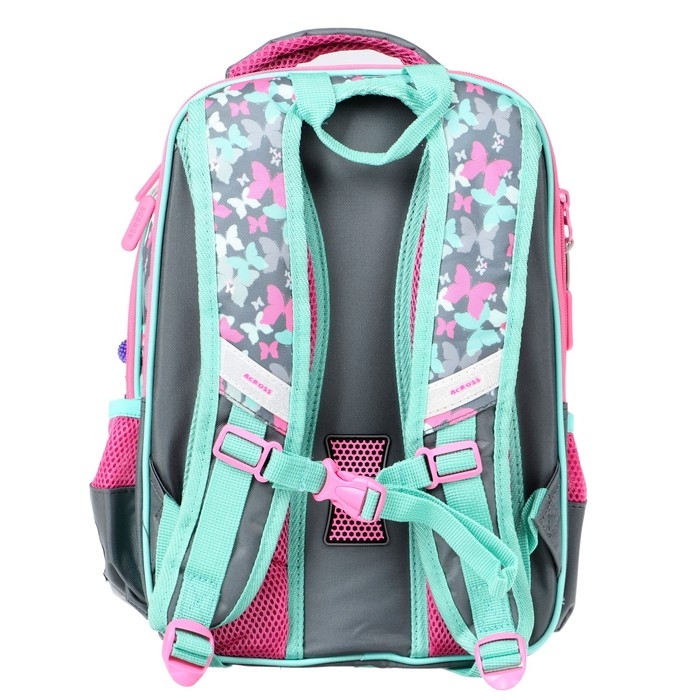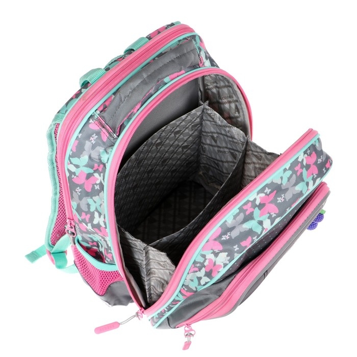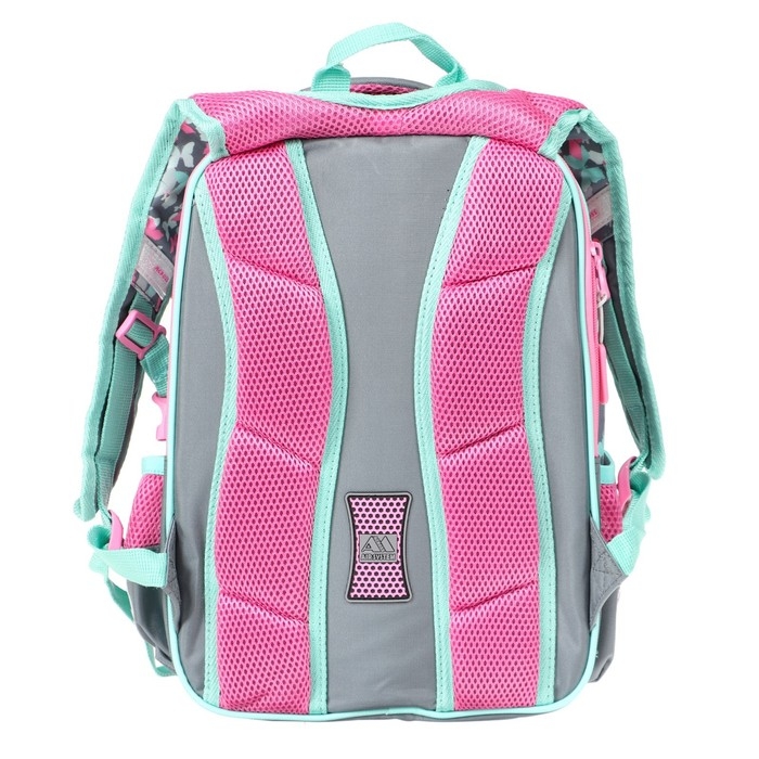 Рельефная ортопедическая спинка с каналами для циркуляции воздуха и сетчатой мембраной. В основном, самом большом отделении расположены жесткие разделители в переднем отделении предусмотрен органайзер. Два боковых сетчатых кармана. Усиленная ручка обеспечивает надежную фиксацию в руке ребёнка, а также имеется дополнительная петля, чтобы повесить ранец на крючок. По всей поверхности рюкзака(со всех сторон) расположены светоотражающие элементы. Рюкзак выполнен из влагостойкого материала.