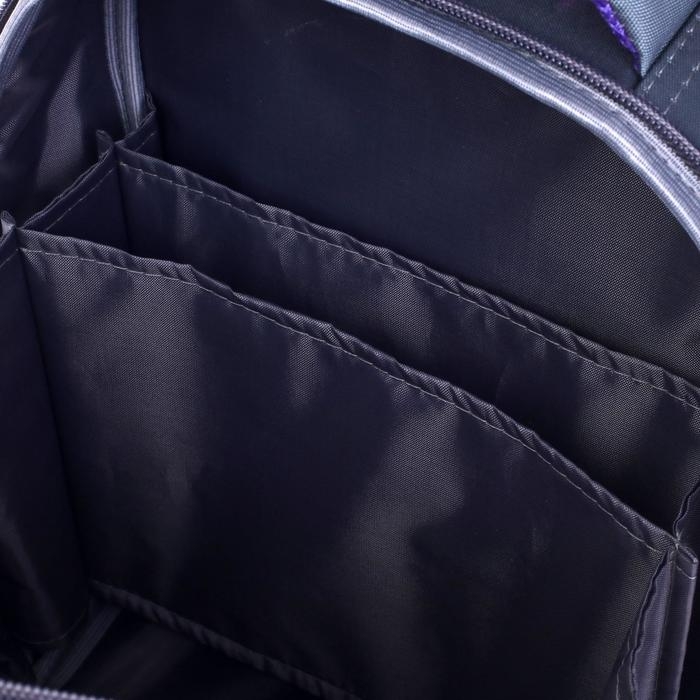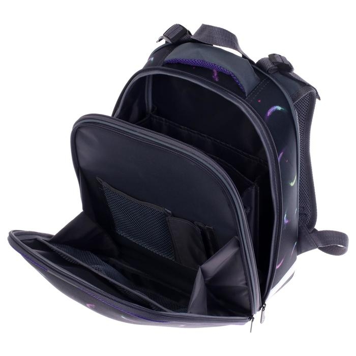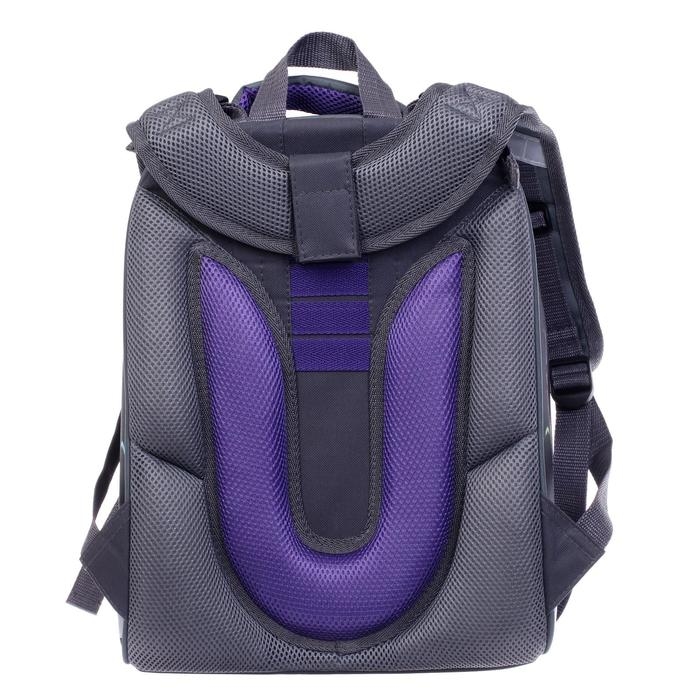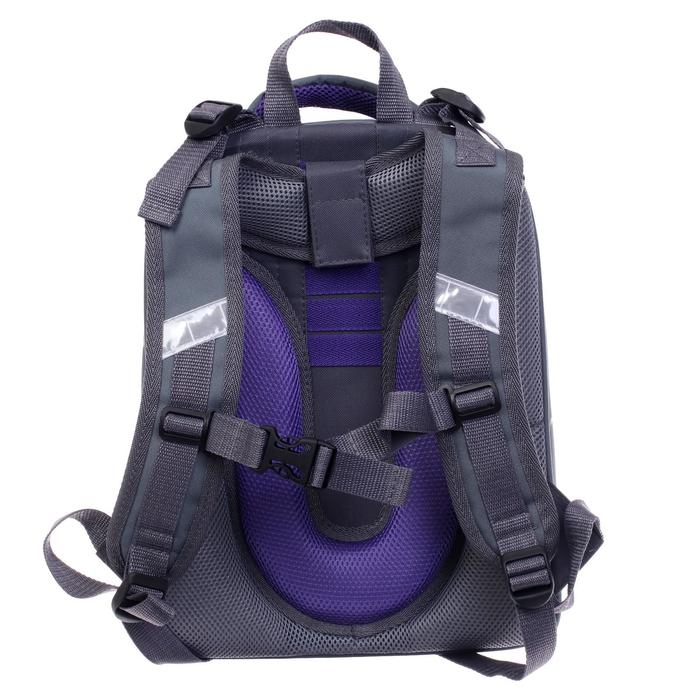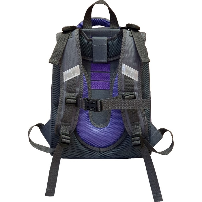 Ранец изготовлен из формованного EVA-материала и высокопрочного непромокаемого полиэстера. Размер 30 х 38 х 16 см. Вес 900 г. Прочные формованные стенки и дно ранца позволяют надежно защитить содержимое от влаги, загрязнений и предотвращают его замятие. Ранец с двумя вместительными отделениями, закрывающимися на реверсивную пластиковую молнию с металлическими «бегунками»; в первом — «плавающие» перегородки для тетрадей и учебников, во втором – большой карман из сетки и карманы-органайзеры для канцелярских принадлежностей. Плотная спинка с анатомическими элементами дополнительно укреплена пластиком, сверху – дышащая трехслойная сетка. Лямки-маечка плотные, мягкие. Регулируются по длине и высоте, что позволяет без труда отрегулировать их по росту ребенка. Ранец снабжен надежным нагрудным фиксатором. Есть удобная мягкая ручка для переноски и дополнительная петлевая ручка для размещения ранца на крюке. На дне ранца есть две пластиковые ножки. В соответствии с требованиями к безопасности на дороге, ранец имеет светоотражающие элементы на лямках и корпусе.