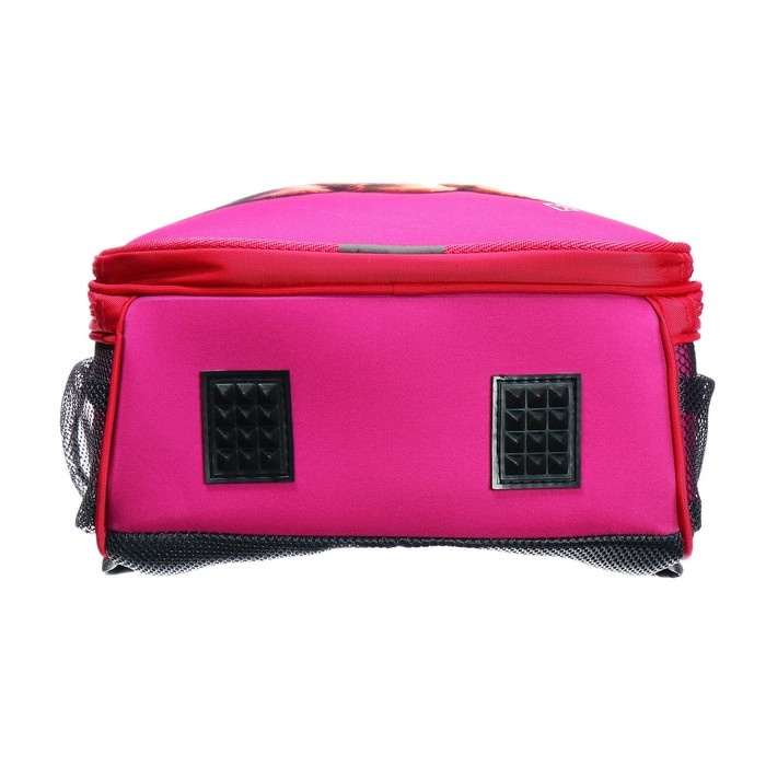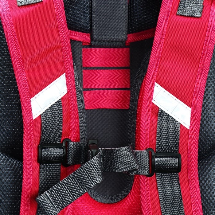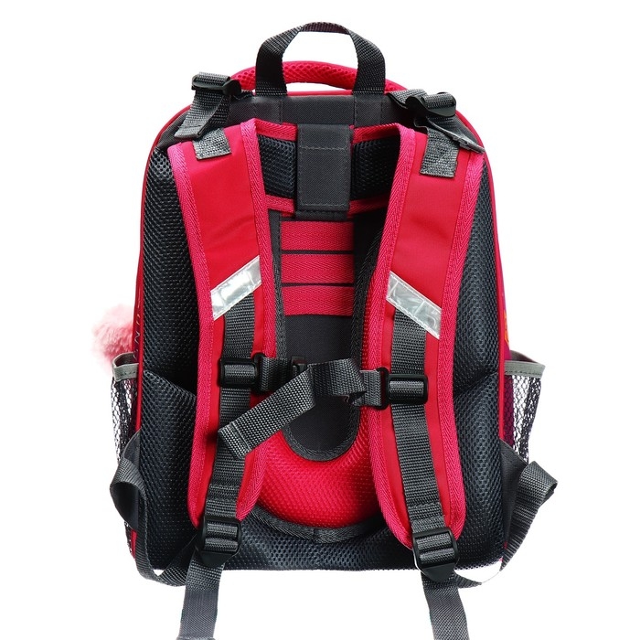 Ранец из формованного EVA-материала и высокопрочного непромокаемого полиэстера. Два вместительных отделения на реверсивной пластиковой молнии; в первом — «плавающие» перегородки для тетрадей и учебников, во втором – большой карман из сетки и карманы-органайзеры. Спинка с анатомическими элементами дополнительно укреплена пластиком, сверху – дышащая трехслойная сетка. Лямки-маечка плотные, мягкие. Регулируются по длине и высоте. Ранец снабжен нагрудным фиксатором и двумя боковыми карманами из прочной сетки. Есть мягкая ручка для переноски и дополнительная петлевая ручка для размещения ранца на крюке. На дне две пластиковые ножки. Ранец имеет светоотражающие элементы на лямках и корпусе. Брелок в комплекте.