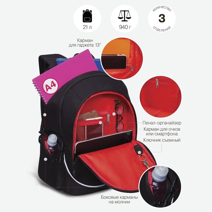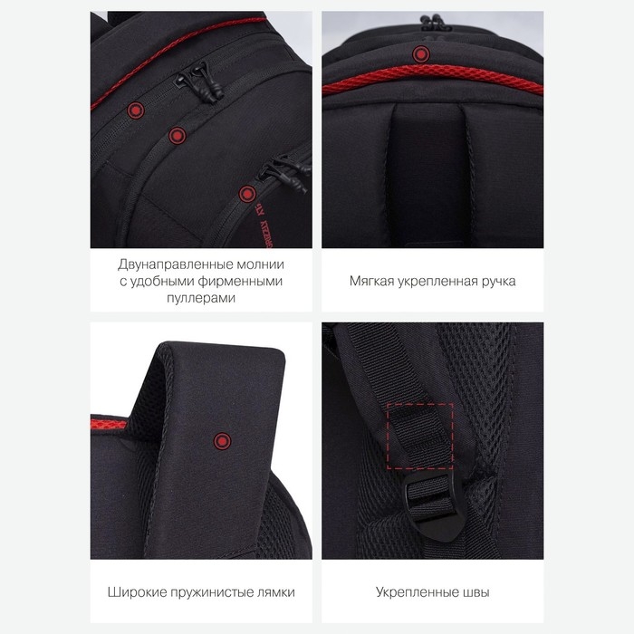 Рюкзак молодёжный 44 х 28 х 23 см, Grizzly, эргономичная спинка, отделение для ноутбука, чёрный/красный