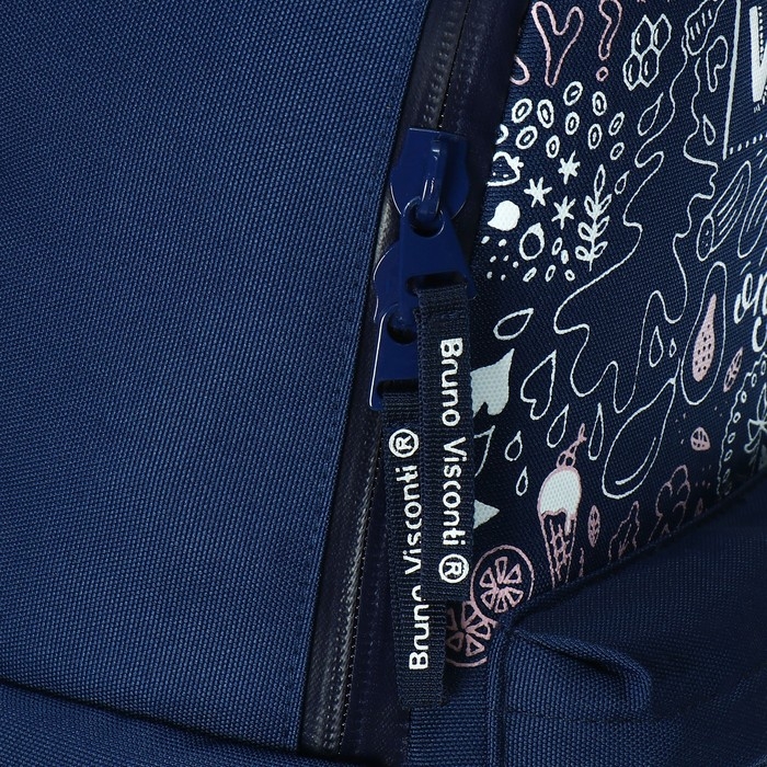 Рюкзак BrunoVisconti® молодежный синий «VEGAN». В производстве рюкзака «VEGAN» от Bruno Visconti использовались сложнейшие современные технологии нанесения на ткань. Рюкзак износостойкий и прослужит долго благодаря водонепроницаемой, морозостойкой и грязеотталкивающей ткани плотностью 900 D. Надежные, ВОДОНЕПРОНИЦАЕМЫЕ двунаправленные реверсивные 10-мм молнии с 5-см пуллером на замках удобны в эксплуатации, позволяют легко открывать и закрывать рюкзак. Износостойкая фирменная подкладка BRUNO VISCONTI тщательно подобрана и сочетаетя с дизайном и цветом рюкзака.