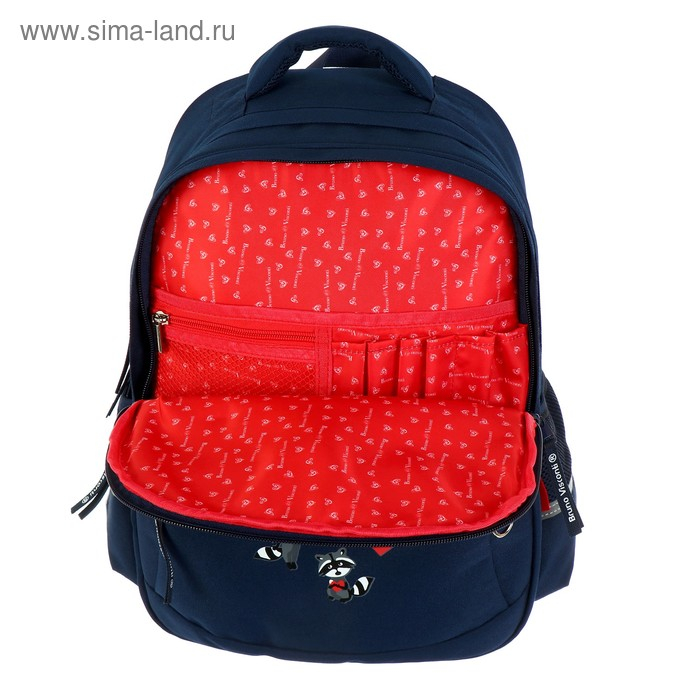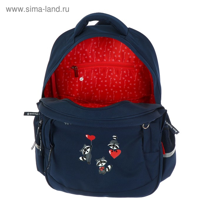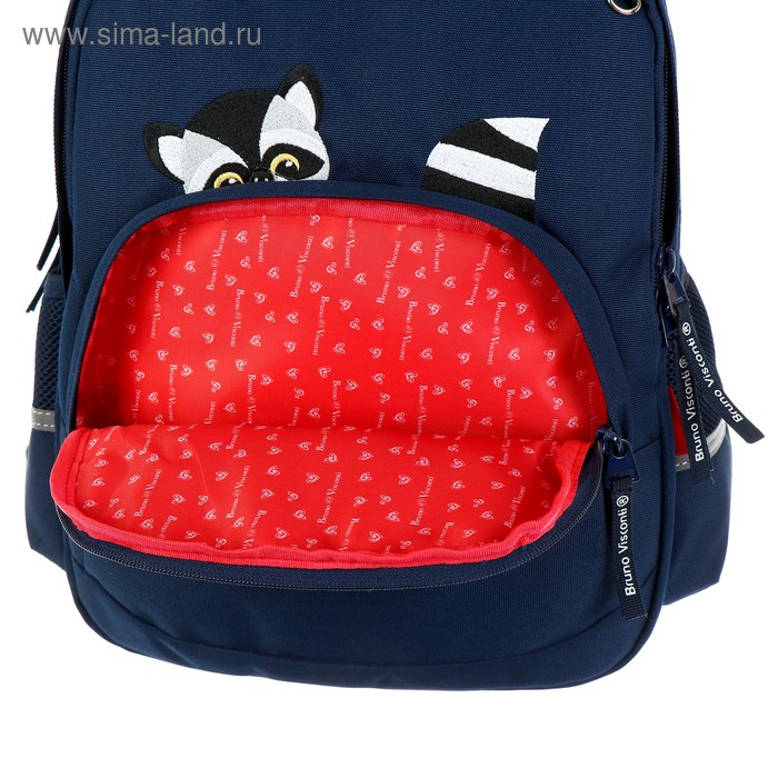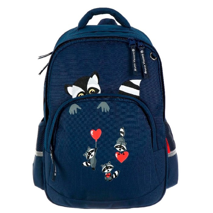 Рюкзак BrunoVisconti® классический синий с эргономичной спинкой «ЕНОТЫ,СЕРДЕЧКИ». Рюкзак школьный серии Junior «ЕНОТЫ,СЕРДЕЧКИ» ТМ BRUNO VISCONTI отличается мягкими боковыми и передними стенками при эргономичной посадке. Для его производства использовалась ткань premium качества: водонепроницаемая, морозостойкая, с повышенной износостойкостью, грязеотталкивающая плотностью 900 DEN. Благодаря сложнейшим современным технологиям нанесения на ткань рюкзак украшает авторский дизайн, соответствующий последним трендам. Плотная фирменная подкладка BRUNO VISCONTI идеально сочетается с дизайном и цветом самого рюкзака. Двунаправленные реверсивные надежные 8-мм молнии с 5-см пуллером на замках позволяют легко открывать и закрывать рюкзак. Вместительный рюкзак имеет большое отделение для тетрадей и учебников с потайным карманом и отделение для тетрадей с органайзером для канцтоваров.