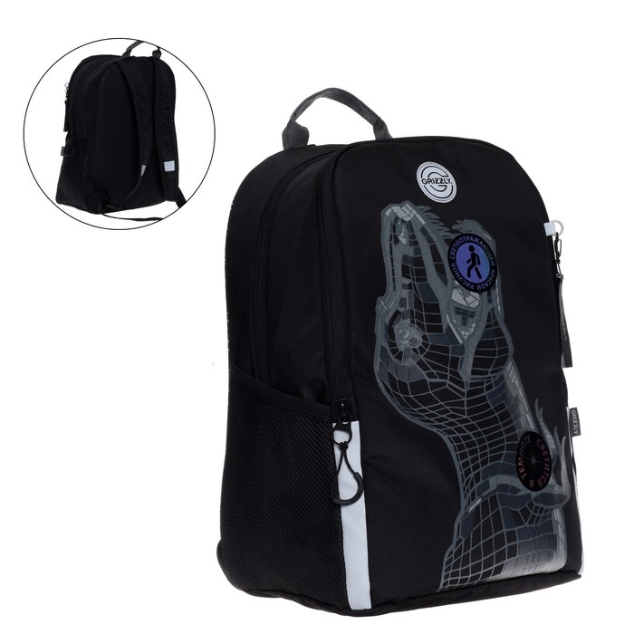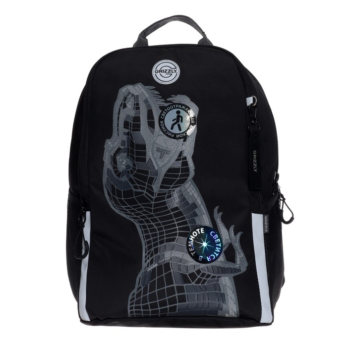 Рюкзак школьный Grizzly "Дино", 38 х 29 х 17.5 см, эргономичная спинка, чёрный/серый