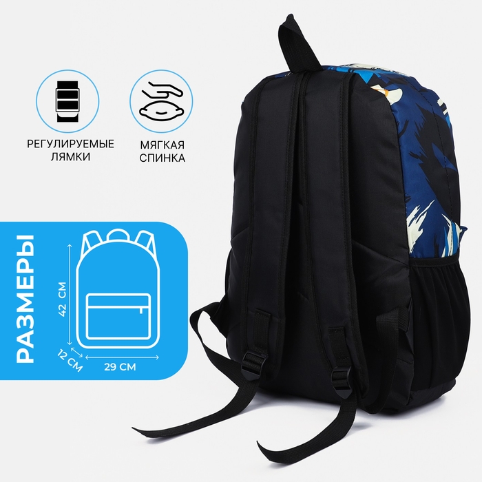 Рюкзак школьный на молнии, 3 наружных кармана, цвет синий/белый