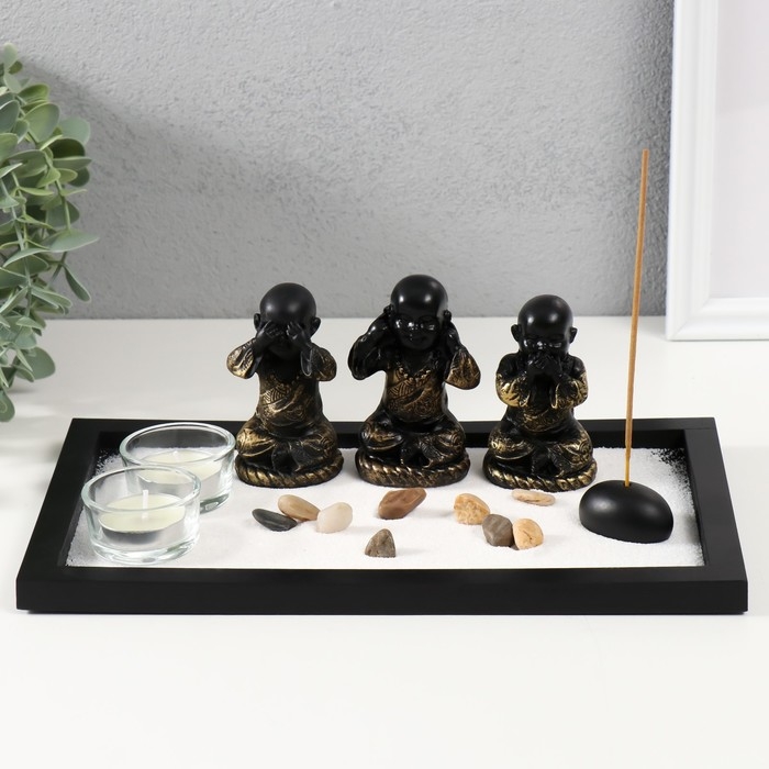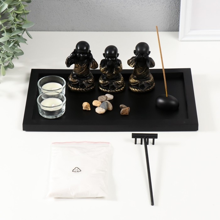 Сад камней Дзен "Ничего не вижу, не слышу, не скажу" с 2мя свечками и аромапалочкой 28х16,5