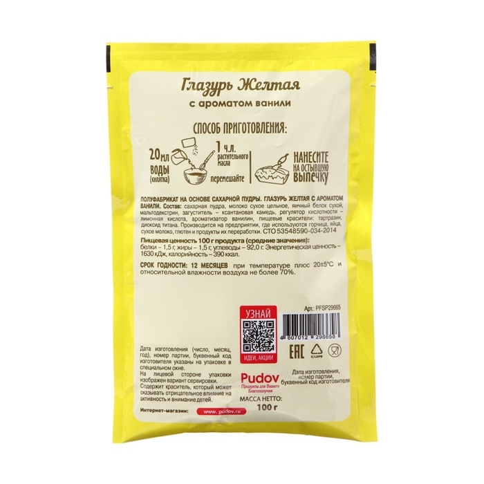 Жёлтая сахарная глазурь С.Пудовъ украсит ваш десерт - печенье, торт, кулич, кексы, маффины. К смеси добавьте 20 мл горячей воды и 1 ч.л. растительного масла. Тщательно перемешайте, нанесите на поверхность готового охлажденного изделия. Готово!