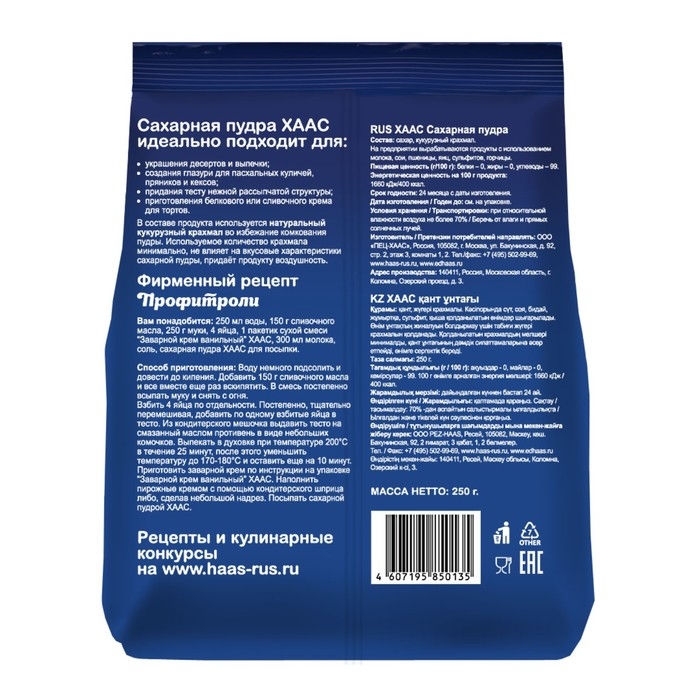 Сахарная пудра от торговой марки HAAS имеет белоснежный, безупречно белый цвет , который идеален для приготовления кремов и глазурей. Воздушная пудра, без комочков. Экстра-тонкий помол, быстро растворяется, обеспечивая наилучший результат при приготовлении кремов (на основе молока или сливок либо яиц), при декорировании изделий. Сахарная пуда HAAS – универсальный продукт, который используется при выпечке (при приготовлении теста, ей можно заменить сахар); при приготовлении глазури, шоколада, марципанов, разнообразных коктейлей; для декорирования выпечки: печенье, кексы, торты и т.д. Продукт представлен в удобном формате упаковки 250 грамм, которой хватит надолго.