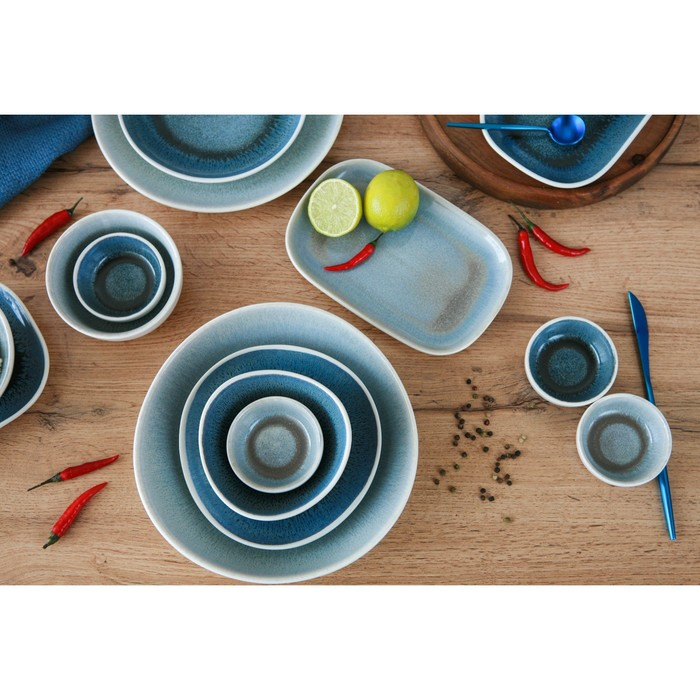 В цвете посуды преобладают тёмно-синие, серые и бирюзовые оттенки. Также изделия дополнены лёгкими разводами и вкраплениями.