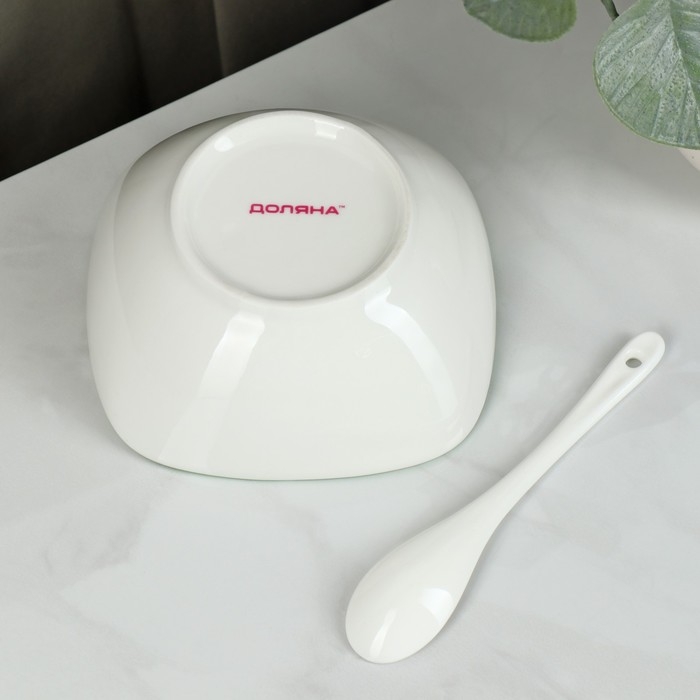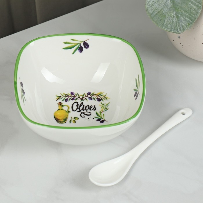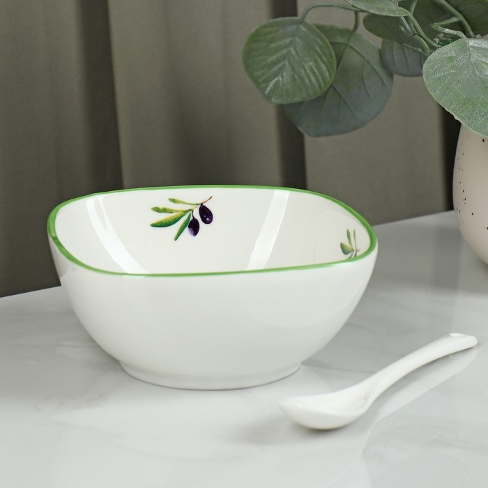 Салатник фарфоровый с ложкой Доляна «Олива», 300 мл