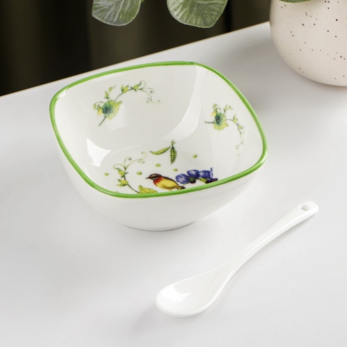 Салатник фарфоровый с ложкой Доляна «Зелёный сад», 250 мл