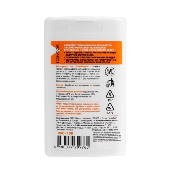Салфетки для очистки техники Konoos KSC-100, влажные, для экранов, банка, 100 шт