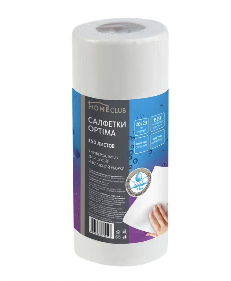 Пакет-пленка. Салфетки Optima 20х23см в рулоне от торговой марки HOMECLUB – универсальные изделия для сухой и влажной уборки для всех видов поверхностей. Салфетка превосходно впитывает влагу и легко отжимается, эффективно удаляет загрязнения, не оставляет разводов и ворсинок. В большой упаковке 150 рулонных салфеток.