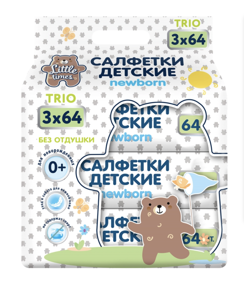 Салфетки влажные детские LITTLE TIMES для очищения кожи, без отдушки, 3х64шт