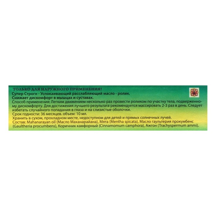 Противопоказания: Супер Стронг является полностью натуральным аюрведическим средством, поэтому препарат практически не имеет противопоказаний. Масло не стоит использовать, если у вас имеется индивидуальная непереносимость каких-либо составляющих продукта. Средство применяется с осторожностью в детском возрасте. Детям до 2 лет применение продукта не рекомендуется.