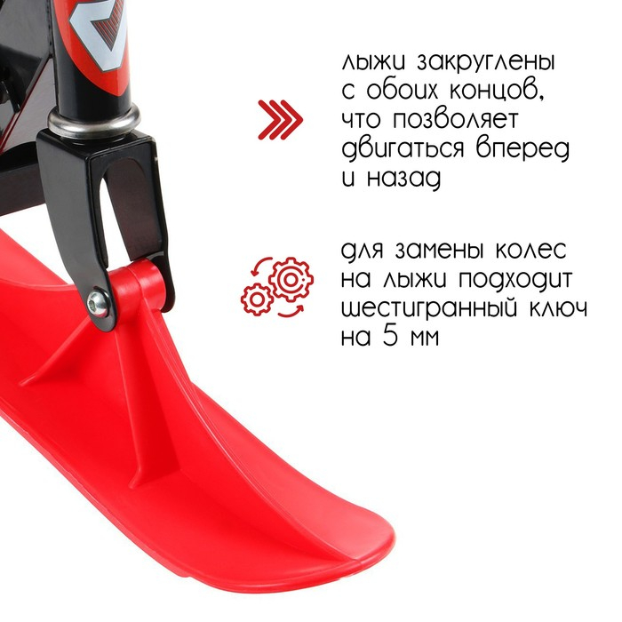 Самокат-снегокат актуален зимой и летом. На колёсах можно кататься по любым ровным поверхностям в сухое время года, зимой — на лыжах по снегу.